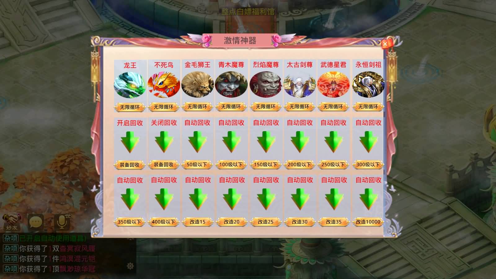 3,增加新的皇帝套和对应首饰(土属性)祖神,以及新宝宝伤害到祖神,新时装到祖神(究级加3万金元宝可合成)+礼包里面有新皇帝套,首诗,➕宝宝和新时装,有的工能全开