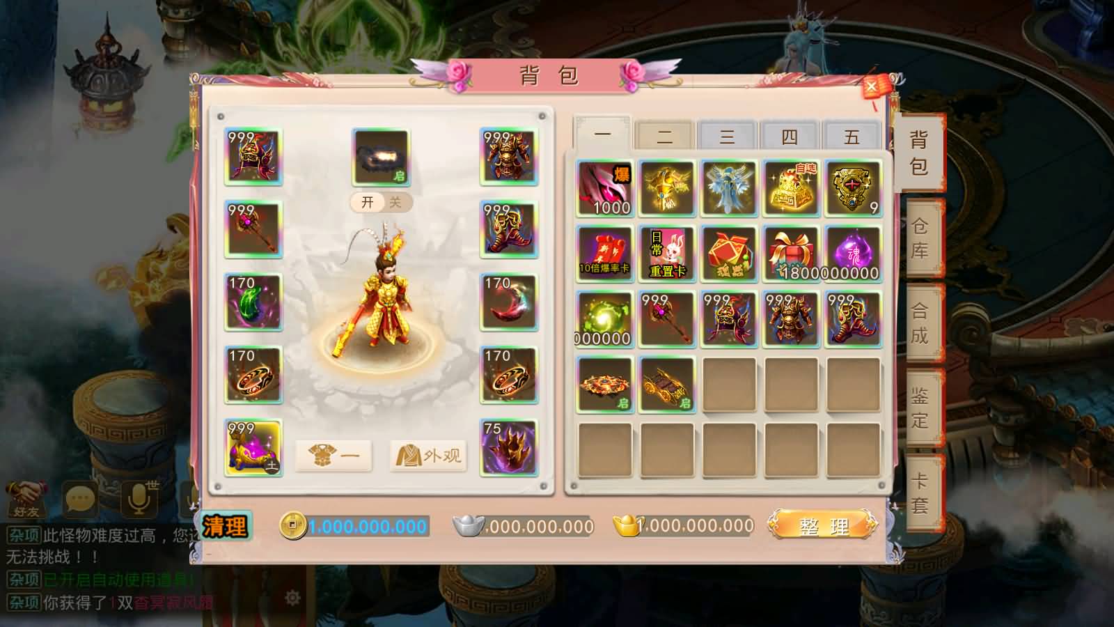 4,boss5张门票打可爆重置卡,女帝套,和终极时装,山海元宝,金元宝,人宠升级丹,悟饭,材料,一条龙,